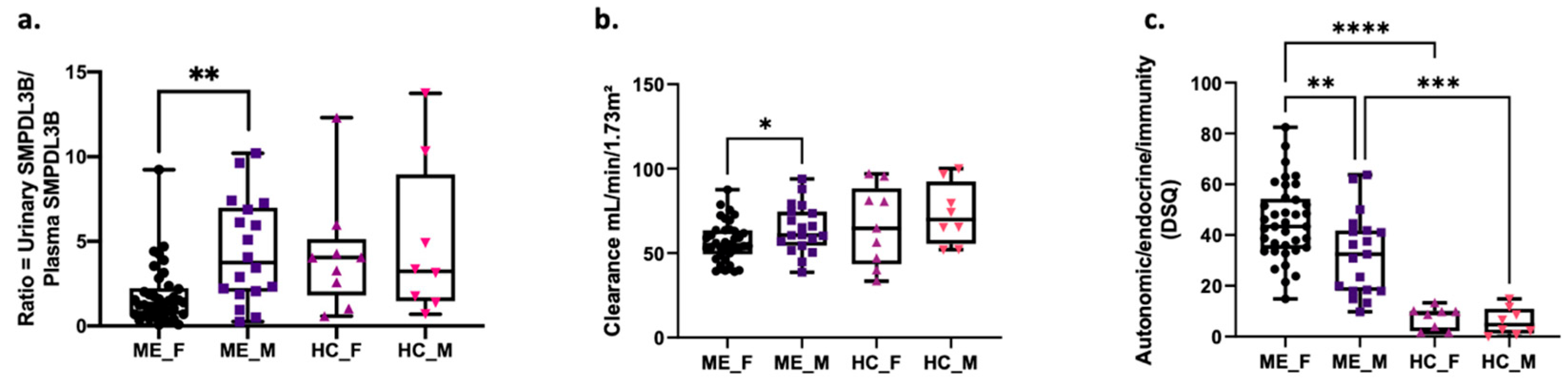 2.4. Sex-Specific Differences in SMPDL3B Levels, Renal Function and ME Symptoms