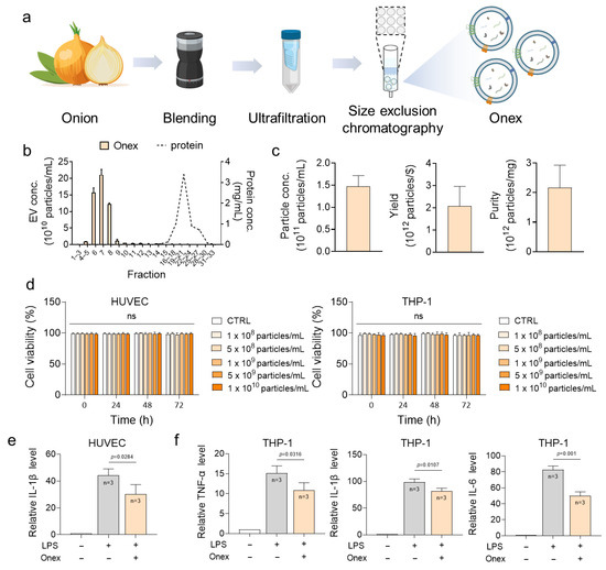 Onex were isolated from Allium cepa purchased from a local market in Korea using a sequential procedure involving blending, centrifugation, ultrafiltration, and size-exclusion chromatography (Cat. No. ICO-70, Izon Science, Christchurch, New Zealand).