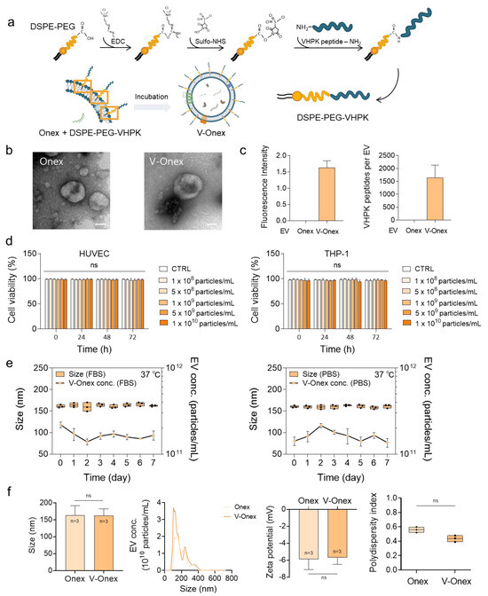 Figure 2. Construction and characterization of VHPK-engineered vesicles (V-Onex). (a) Schematic illustration of the synthesis of DSPE-PEG-VHPK conjugates via EDC/NHS chemistry. (b) Representative TEM images of Onex and V-Onex showing preserved vesicle morphology. Scale bar = 50 nm. (c) Quantification of surface-conjugated VHPK peptides on V-Onex based on FITC fluorescence intensity and NTA particle count. (d) Cell viability of HUVECs and THP-1 cells after treatment with V-Onex at concentrations ranging from 1 × 108 to 1 × 1010 particles/mL for 24, 48, and 72 h, measured using the trypan blue assay. (e) Size and particle concentration of V-Onex incubated in PBS or PBS containing 10% FBS at 37 °C over 7 days. (f) Zeta potential, size, particle concentration, and PDI of Onex and V-Onex. Data are presented as mean ± SEM. Black dots represent individual experimental data points. Statistical significance was determined using one-way ANOVA: ns: not significant. EV, extracellular vesicle; FBS, fetal bovine serum; HUVEC, human umbilical vein endothelial cell; NTA, nanoparticle tracking analysis.