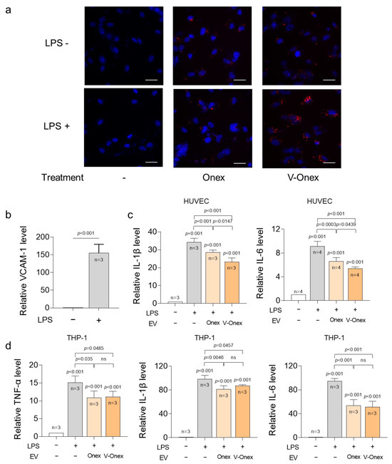 Figure 3. Targeting capability of V-Onex in endothelial cells and anti-inflammatory effect in HUVECs and THP-1 cells. (a) Fluorescence microscopy images showing cellular uptake of DiI-labeled Onex and V-Onex in HUVECs with or without LPS stimulation with size bars indicating 50 μm. (b) Relative VCAM-1 mRNA expression in HUVECs showing significant upregulation upon LPS stimulation, assessed using qRT-PCR. (c) Relative mRNA expression levels of IL-1β and IL-6 in LPS-stimulated HUVECs treated with Onex or V-Onex, analyzed using qRT-PCR. (d) Relative mRNA expression levels of TNF-α, IL-1β and IL-6 in LPS-stimulated THP-1 cells treated with Onex or V-Onex, analyzed using qRT-PCR. Data are presented as mean ± SEM. Statistical significance was determined using one-way ANOVA: ns: not significant. EV, extracellular vesicle; HUVEC, human umbilical vein endothelial cell; LPS, lipopolysaccharide.