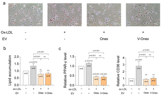 Figure 5. Inhibitory effects of V-Onex on foam cell formation in ox-LDL–stimulated macrophages. (a) Representative images with size bars indicating 100 µm and (b) quantification of intracellular lipid accumulation visualized by ORO staining in macrophages. (c) Relative mRNA expression levels of PPAR-γ and CD36 in THP-1 cells stimulated with ox-LDL (50 μg/mL) and treated with and without EVs, Onex, or V-Onex (1 × 1010 particles/mL) for 24 h, analyzed using qRT-PCR. Data are presented as mean ± SEM. Statistical significance was determined using one-way ANOVA: ns: not significant. EV, extracellular vesicle; ORO, Oil Red O, ox-LDL, oxidized low-density lipoprotein.