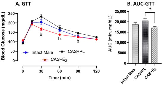 Glucose tolerance is improved in CAS + E2 rats. (A) Glucose tolerance test (GTT) and (B) area under the curve for GTT (AUC-GTT) in intact male (n = 10), castrated placebo (CAS + PL, n = 11) and castrated E2-treated (CAS + E2, n = 11) rats. Data is expressed as mean ± SEM. b p < 0.05 vs. CAS + PL, analyzed using two-way ANOVA with repeated measure followed by Tukey’s post hoc test. Capped line indicates significant differences between groups. * p < 0.05, one-way ANOVA followed by Tukey’s post hoc test.