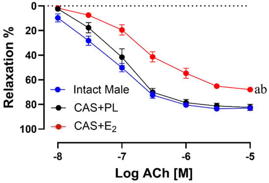 Acetylcholine (ACh)-induced vasorelaxation is reduced in CAS + E2 rats. Vasorelaxation responses to cumulative concentrations of ACh (10−8 to 10−5 M) in intact aortic rings precontracted with phenylephrine (PE, 2 µM) of intact male, castrated placebo (CAS + PL) and castrated E2-treated (CAS + E2) rats. Data is expressed as mean ± SEM. n = 8 per group, a p < 0.05 vs. intact male, b p < 0.05 vs. CAS + PL, analyzed using two-way ANOVA with repeated measure followed by Tukey’s post hoc test.