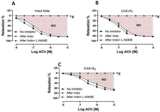 NO-mediated aortic relaxation is reduced in CAS + E2 rats. Contribution of cyclooxygenase (COX) metabolites and nitric oxide (NO) to acetylcholine (ACh)-induced relaxation in intact aortic rings precontracted with phenylephrine (PE, 2 µM) of (A) intact male, (B) castrated placebo (CAS + PL) and (C) castrated E2-treated (CAS + E2) rats. Concentration response curve (CRC) to ACh (10−8 to 10−5 M) was generated in the absence of inhibitor and then after Indomethacin (Indo, 10 µM), followed by L-NAME (200 µM) in the presence of Indo (10 µM). Data is expressed as mean ± SEM. n = 8 per group, * p < 0.05 vs. no inhibitor, # p < 0.05 vs. after Indo, analyzed using two-way ANOVA with repeated measure followed by Tukey’s post hoc test. The shaded area represents the contribution of nitric oxide (NO) to vasorelaxation. Indo, Indomethacin; L-NAME, Nω-nitro-L-arginine methyl ester.