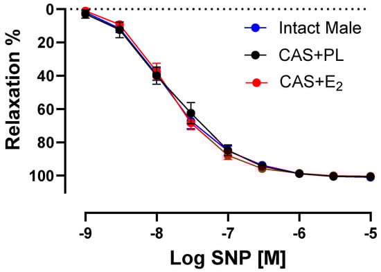 Sodium nitroprusside (SNP)-induced aortic relaxation is similar among groups. Relaxation responses to cumulative concentrations of SNP (10−9 to 10−5 M) in endothelium denuded aortic rings precontracted with phenylephrine (PE, 2 µM) of intact male, castrated placebo (CAS + PL) and castrated E2-treated (CAS + E2) rats. Data is expressed as mean ± SEM. n = 8 per group, analyzed using two-way ANOVA with repeated measure.