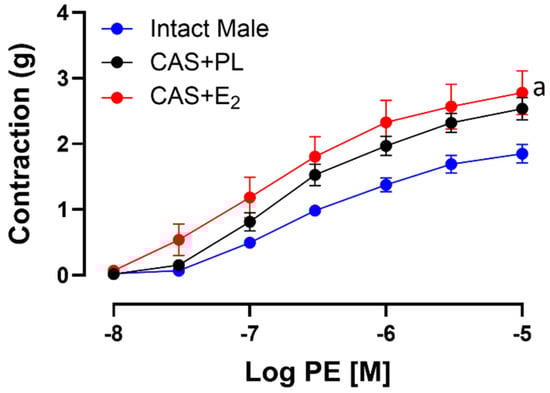 Phenylephrine (PE)-induced aortic contraction is increased in CAS + E2 rats. Contractile responses to cumulative concentrations of PE (10−8 to 10−5 M) in intact aortic rings of intact male, castrated placebo (CAS + PL) and castrated E2-treated (CAS + E2) rats. Data is expressed as mean ± SEM. n = 8 per group, a p < 0.05 vs. intact male, analyzed using two-way ANOVA with repeated measure followed by Tukey’s post hoc test.