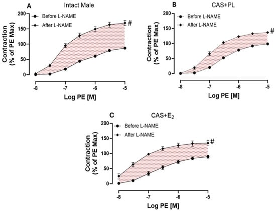 L-NAME potentiation of phenylephrine (PE)-induced vasoconstriction is reduced in castrated rats. PE-induced vasoconstriction in intact aortic rings of (A) intact male, (B) castrated placebo (CAS + PL) and (C) castrated E2-treated (CAS + E2) rats. Concentration response curve (CRC) to PE (10−8 to 10−5 M) was generated before and after L-NAME (200 µM) in the presence of Indomethacin (Indo, 10 µM). Results are presented as a percentage of the maximal response to PE obtained in the absence of inhibitor. Data is expressed as mean ± SEM. n = 8 per group, # p < 0.05 vs. before L-NAME, analyzed using two-way ANOVA with repeated measure followed by Šídák’s post hoc test. The shaded area represents the contribution of endothelium-derived nitric oxide (NO) during smooth muscle contraction. L-NAME, Nω-nitro-L-arginine methyl ester.