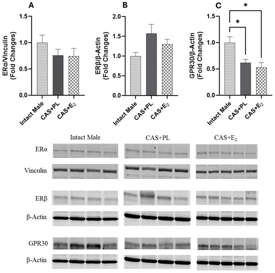 GPR30 expression is reduced in aorta of castrated rats. Western blot analysis of (A) ERα, (B) ERβ and (C) GPR30 in aorta of intact male (n = 4), castrated placebo (CAS + PL, n = 4) and castrated E2-treated (CAS + E2, n = 5) rats. Protein levels were quantified by densitometric analysis and normalized to corresponding housekeeping protein. Data is expressed as mean ± SEM. Each lane represents a sample from a different rat. Bands of target and housekeeping proteins were shown from the same membrane. Capped lines indicate significant differences between two groups. * p < 0.05, analyzed using one-way ANOVA followed by Tukey’s post hoc test. ERα, estrogen receptor α; ERβ, estrogen receptor β; GPR30, G protein-coupled estrogen receptor 30.