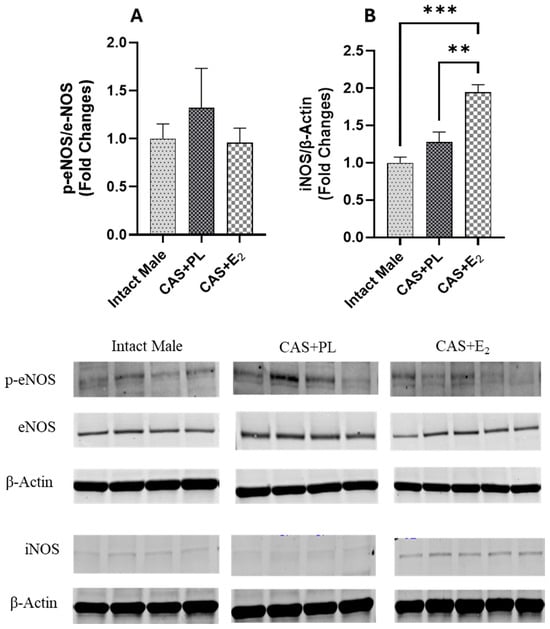 iNOS expression is elevated in aorta of CAS + E2 rats. Western blot analysis of (A) p-eNOS/eNOS and (B) iNOS in aorta of intact male (n = 4), castrated placebo (CAS + PL, n = 4) and castrated E2-treated (CAS + E2, n = 5) rats. Protein levels were quantified by densitometric analysis and normalized to corresponding housekeeping protein. Data is expressed as mean ± SEM. Each lane represents a sample from a different rat. Bands of target and housekeeping proteins were shown from the same membrane. Capped lines indicate significant differences between two groups. ** p < 0.01, *** p < 0.001, analyzed using one-way ANOVA followed by Tukey’s post hoc test. eNOS, endothelial nitric oxide synthase; p-eNOS, phosphorylated eNOS; iNOS, inducible nitric oxide synthase.