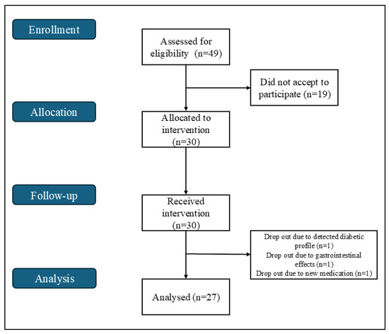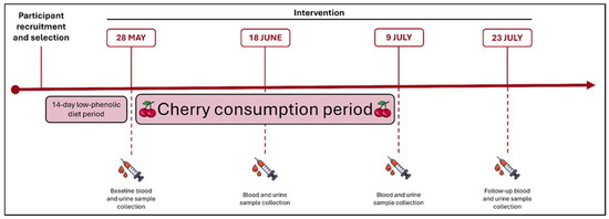 Our study was designed as a longitudinal, single-arm intervention (Figure 1) and was approved by the Ethics Committee of the Local Health Unit of Guarda (document no. 88/2023). The intervention is also registered at ClinicalTrials.gov (ID: NCT07155915; date: 3 September 2025). A total of 49 volunteers were recruited among the Local Health Unit and the Polytechnic Institute of Guarda, of which a total of 27 individuals (20 woman and 7 man) aged 18–64 years old, completed the trial. Inclusion criteria for participants included being between the ages of 18 and 65 and having no known metabolic disorders. Exclusion criteria included consumption of alcohol, smoking, diagnosed chronic diseases, adverse reactions to cherry, use of antibiotics, anxiolytics or supplements, pregnancy or lactation and weight variations > 10% during the previous year.