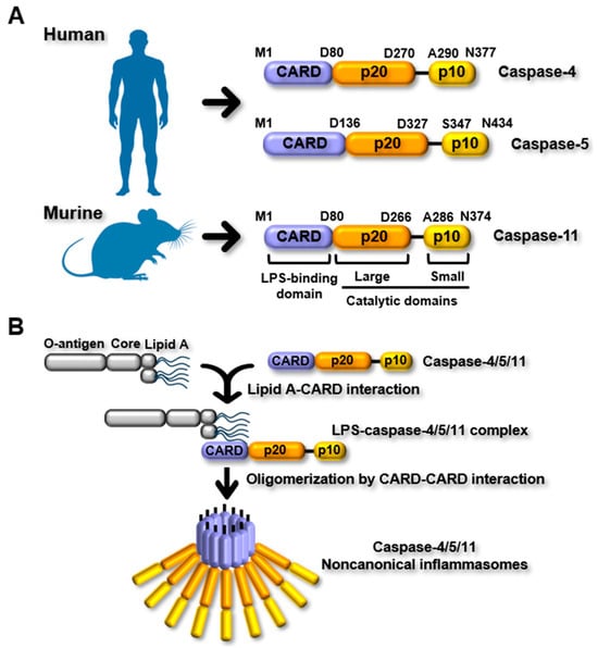 PRRs are crucial components of inflammasomes, serving as sensors that detect PAMPs and DAMPs. Canonical inflammasome PRRs recognize PAMPs and DAMPs and subsequently assemble canonical inflammasomes by engaging caspase-1, either directly or via the adaptor protein ASC [1,2]. In contrast to canonical inflammasomes, noncanonical inflammasome PRRs, such as murine caspase-11 and human caspase-4 and caspase-5 can directly sense PAMPs without the involvement of caspase-1 or ASC [1,2]. Unlike different domain structures of canonical inflammasome PRRs, noncanonical inflammasome PRRs, murine caspase-11 and human caspase-4 and caspase-5, possess the same domain architecture. Each comprises three domains: an N-terminal caspase recruitment domain (CARD), a central large catalytic p20 domain, and a C-terminal small catalytic p10 domain (Figure 1A). Although they have the same structural organization, their amino acid lengths differ: caspase-4, caspase-5, and caspase-11 have 377, 434, and 373 amino acids, respectively (Figure 1A).