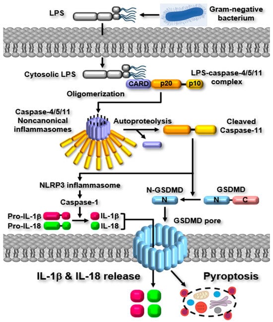 - Elkayam, E.; Gervais, F.G.; Wu, H.; Crackower, M.A.; Lieberman, J. New insights into the noncanonical inflammasome point to caspase-4 as a druggable target. Nat. Rev. Immunol. 2025, 25, 558–568. [Google Scholar] [CrossRef]