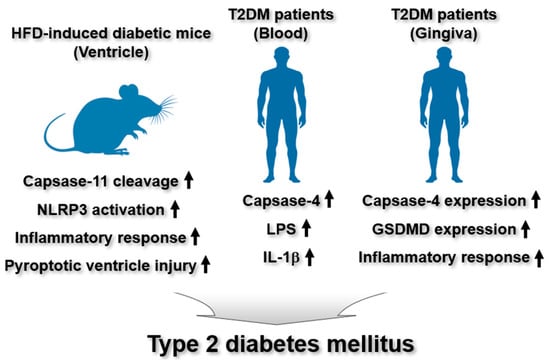 Wang et al. demonstrated the relationship with and effect of oral microbiota on caspase-11 noncanonical inflammatory pathway in patients with T2DM [35]. Salivary levels of Fusobacteriota and Campilobacterota were reduced, while the relative abundance of Proteobacteria was elevated compared to healthy individuals [35]. Biochemical analyses revealed increased mRNA expression levels of caspase-4, NLRP3, caspase-1, ASC, LPS, and the pro-inflammatory cytokine IL-1β, along with a decreased expression level of insulin receptor substrate-1 in the blood of T2DM patients [35]. These findings suggest that alterations in the composition of oral microbiota may contribute to the expression and activation of the caspase-4 noncanonical and NLRP3 canonical inflammasome-mediated inflammatory pathways in T2DM.