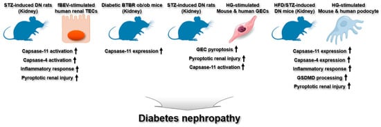Shao et al. investigated the involvement of the murine caspase-4/11 noncanonical inflammasome and GSDMD-driven pyroptosis in glomerular endothelial cells (GECs) and in a mouse model of DN induced by STZ [40]. GSDMD-driven pyroptosis was induced in mouse and human GECs treated with HG [40]. GSDMD-driven pyroptosis contributed to renal damage; however, silencing GSDMD in renal tissues mitigated kidney injury in STZ-induced DN mice [40]. Moreover, HG condition activated the caspase-11 noncanonical inflammasome and induced pyroptosis in mouse GECs, suggesting the pivotal role of caspase-11 noncanonical inflammasome activation and subsequent GSDMD-driven pyroptosis in DN pathogenesis.