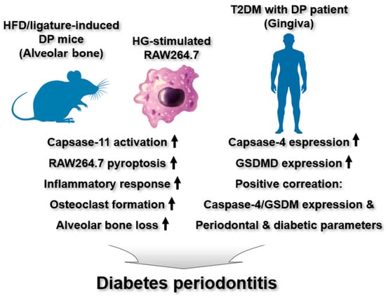 Regulatory roles of noncanonical inflammasomes in DP. In HG-stimulated mouse RAW264.7 macrophages, activation of the caspase-11 noncanonical inflammasome drives inflammatory responses and pyroptosis. In an HFD/ligature-induced mouse model of DP, caspase-11 noncanonical inflammasome is activated, promoting osteoclastogenesis and alveolar bone resorption. Gingival tissues from patients with T2DM and DP show elevated expression of caspase-4 and GSDMD, with their expression levels positively correlating with both periodontal disease severity and diabetic clinical parameters.