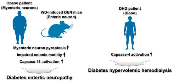 A recent study demonstrated the regulatory function of the noncanonical inflammasome in DEN pathogenesis. Ye et al. showed that caspase-11 noncanonical inflammasome-mediated pyroptosis contributes to DEN pathogenesis in mice with Western diet (WD)-induced enteric nitrergic neuronal degeneration [50]. Elevated pyroptosis levels in the myenteric ganglia were detected in overweight and obese human subjects [50]. An increase in myenteric neuronal pyroptosis accompanied by delayed colonic transit and reduced colonic relaxation responses to electric field stimulation were exhibited in mice with WD-induced enteric nitrergic neuronal degeneration [50]. Moreover, WD promoted pyroptosis of myenteric nitrergic neurons and impaired colonic motility, whereas caspase-11 deficiency prevented both nitrergic myenteric neuronal pyroptosis and colonic dysmotility in mice with enteric nitrergic neuronal degeneration [50]. In vitro study showed that palmitate and LPS induced pyroptosis in nitrergic enteric neurons [50]. These results indicate that the caspase-11 noncanonical inflammasome-triggered pyroptotic pathway contributes to WD-induced myenteric nitrergic neuronal degeneration and colonic dysmotility, highlighting potential therapeutic targets for enteric neuropathy.