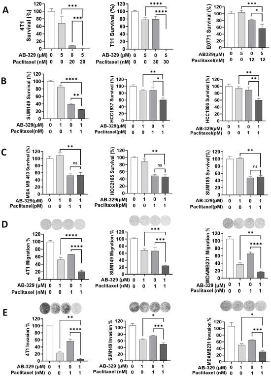 2.2. AB-329 Combined with Paclitaxel Synergistically Inhibited the Proliferation, Migration, and Invasion of TNBC Cells