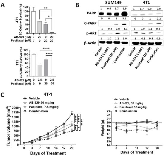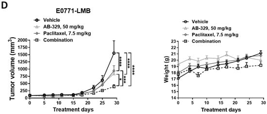2.3. AB-329 Combined with Paclitaxel Synergistically Reduced Tumor Growth in Murine TNBC Models