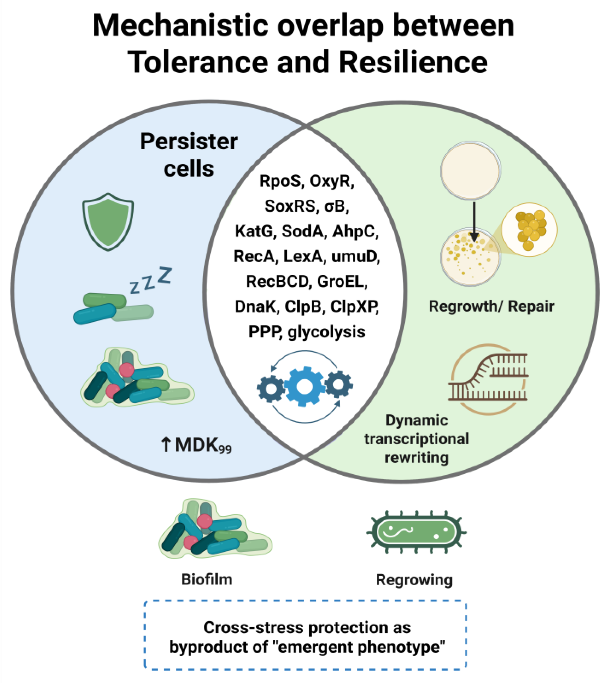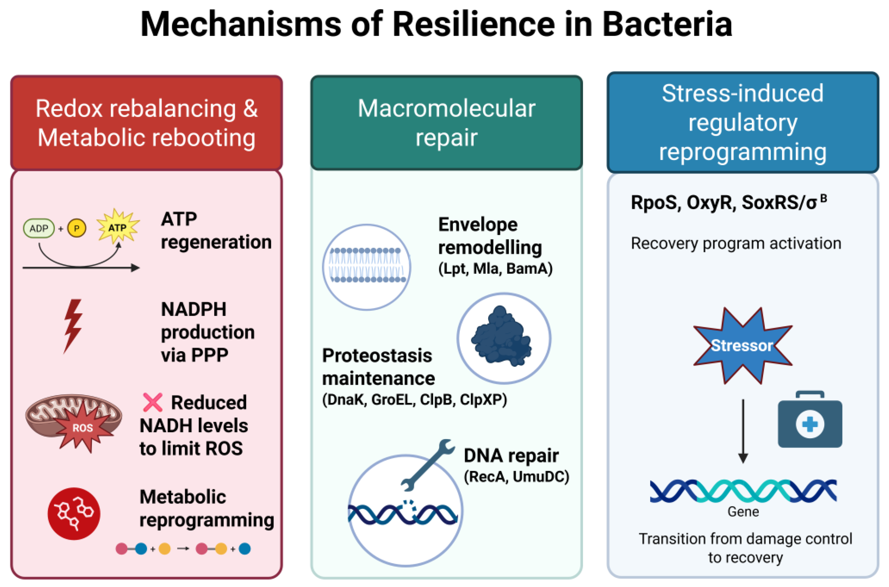 Global stress regulators | RpoS, SoxRS, OxyR, σ^B | Dormancy, metabolic suppression, ROS mitigation | Repair coordination, redox balance, metabolic rebooting | [97,102,103] |