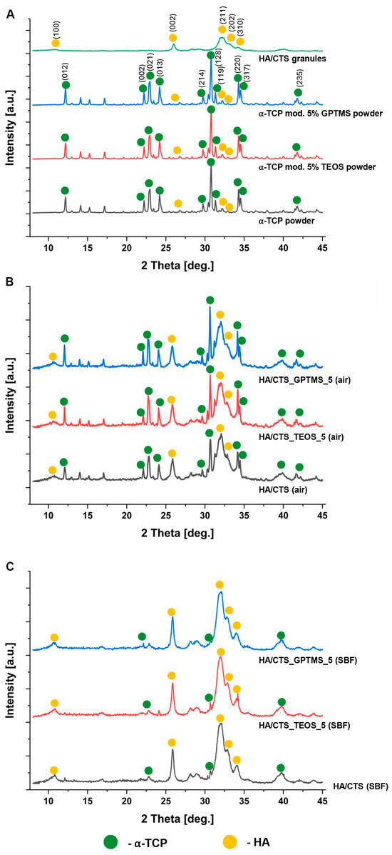 | HA/CTS_GPTMS_2 | α-TCP (2 wt.% GPTMS): HA/CTS granules 3:2 by weight | ||