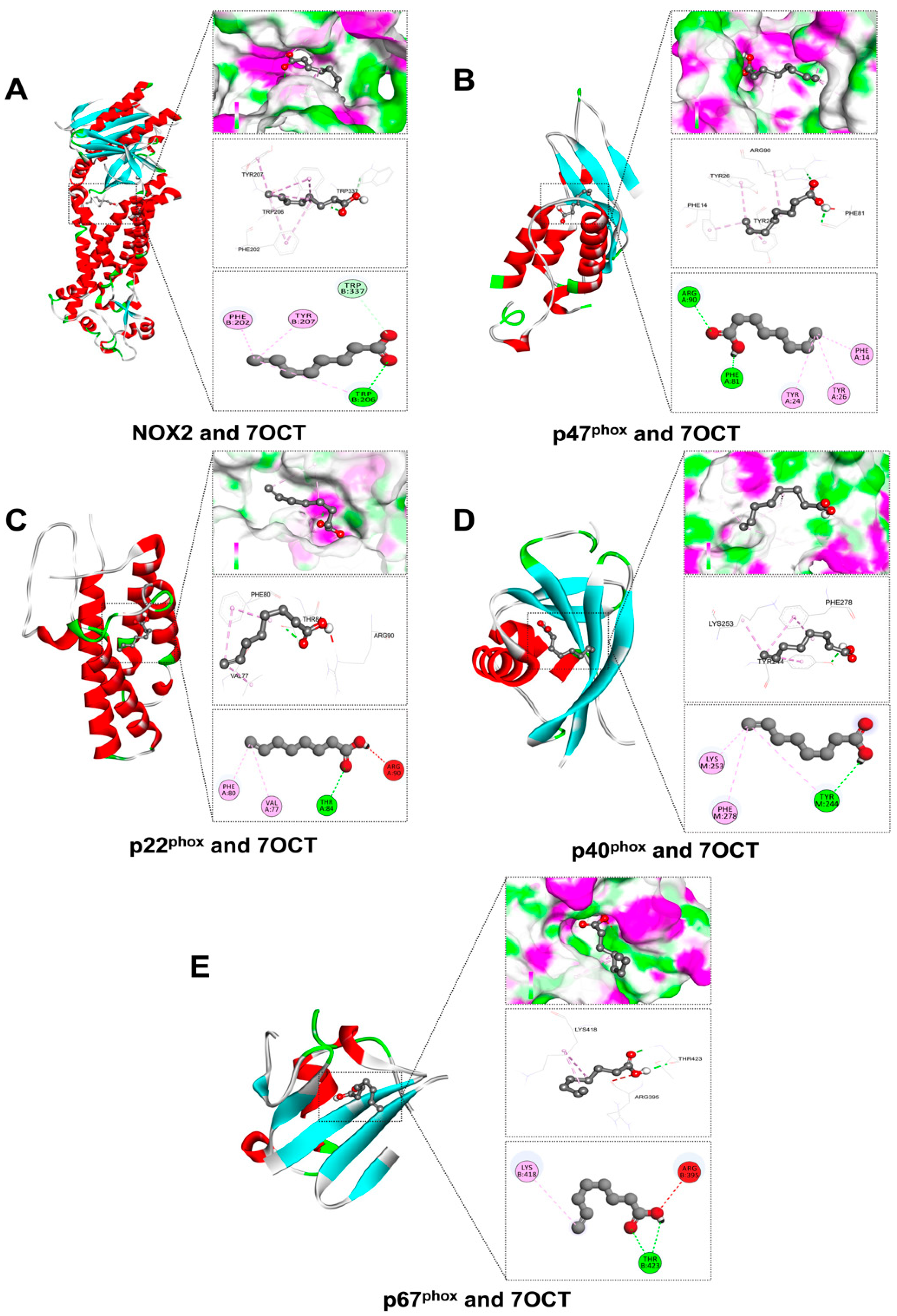 PHE202, TRP207, TRP337, TYR207 | −5.9 | NADPH oxidase 2 (NOX2) | |