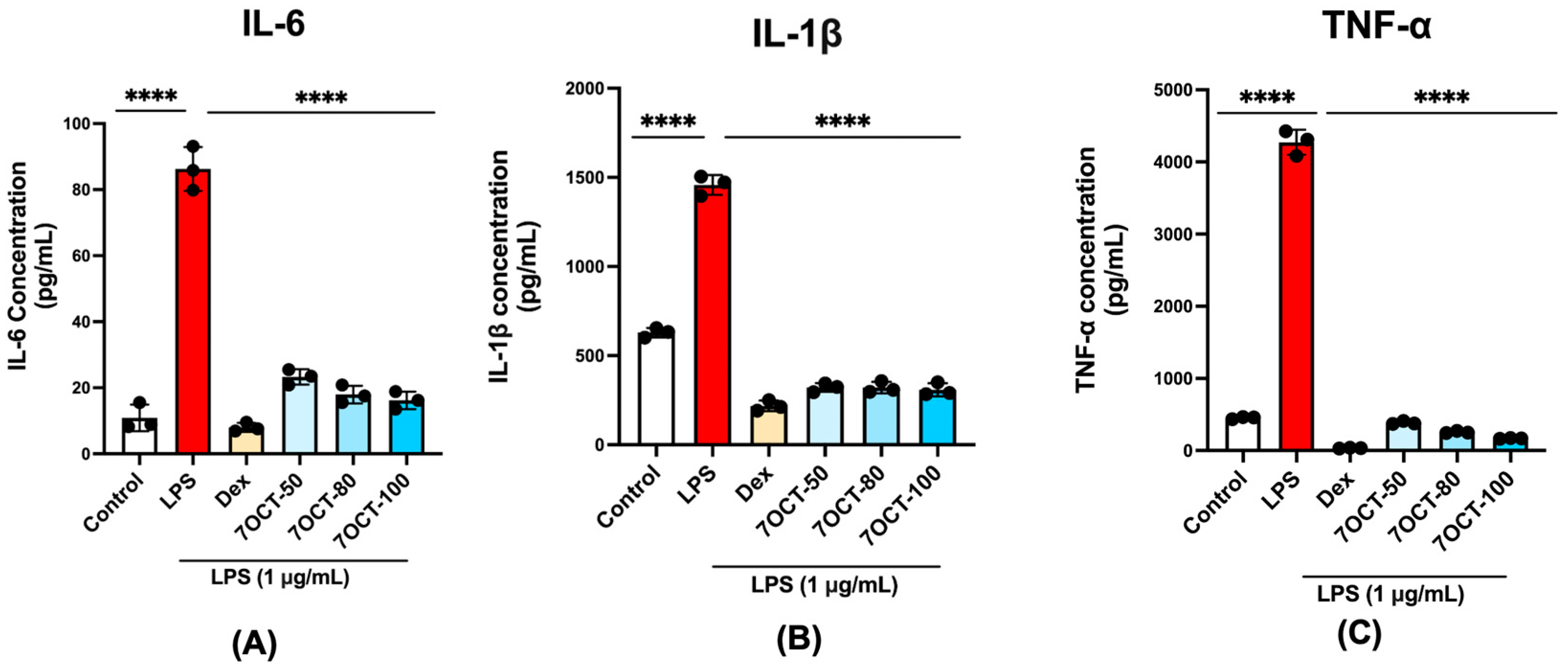 2.3. The Effect of 7OCT on the Expression of Pro-Inflammatory Cytokine Production in LPS-Stimulated Macrophages