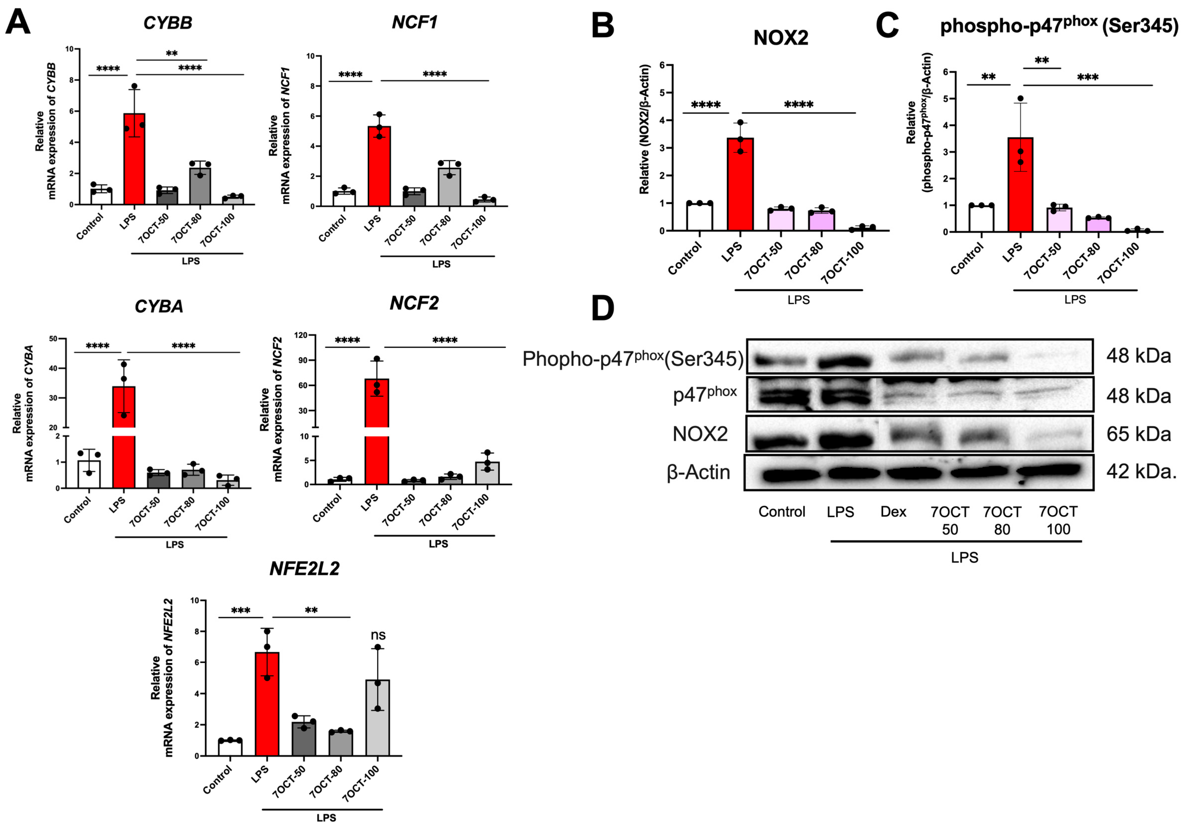 2.5. The Effect of 7OCT on NADPH Oxidase 2 (NOX2) Pathway in LPS-Stimulated Macrophages