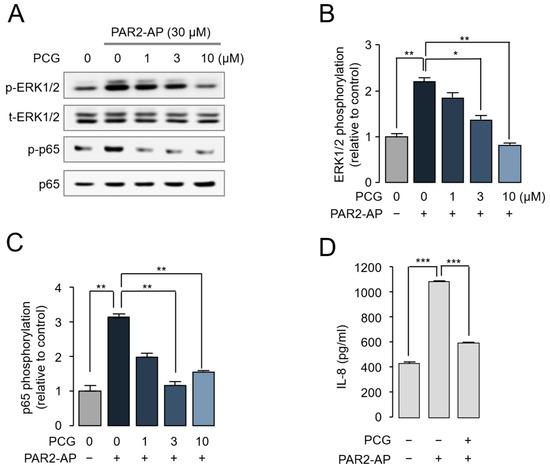2.2. PCG-Mediated Inhibition of PAR2-Induced ERK1/2 and NF-κB Phosphorylation and IL-8 Release in HaCaT Cells