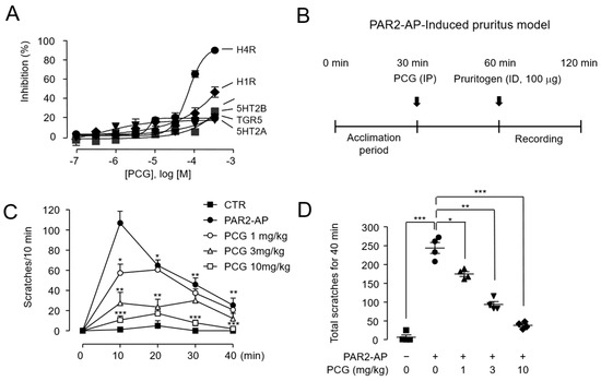 2.4. PCG-Mediated Suppression of PAR2-AP-Induced Scratching in BALB/c Mice