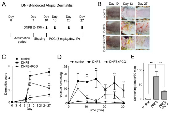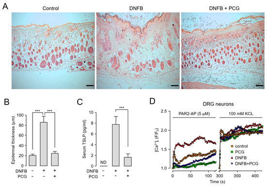 2.5. PCG Attenuates DNFB-Induced Atopic Dermatitis in Mice