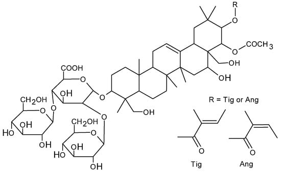 Research conducted on over 1700 varieties of Asian plants and vegetables has shown that saponins occur in 75% of them [7]. Despite the significant differences in the structure of these compounds, their common feature is the presence of a steroid or triterpenoid backbone (aglycone) [8]. Typically, the 3-position of the backbone contains glucuronic acid and sugar residues such as glucose (Glc), xylose (Xyl), and galactose (Gal). Such structures also occur in various escins. A common feature of escins is the presence of a tigloyl and angloyl substituent [3,9]. The extract obtained from horse chestnut (Aesculus hippocastanum) may contain 97.0–100.0% escins, which are a mixture of triterpene saponins composed mainly of escin Ia, escin Ib (β-escin), and isoescin Ia and isoescin Ib (α-escin) [10].