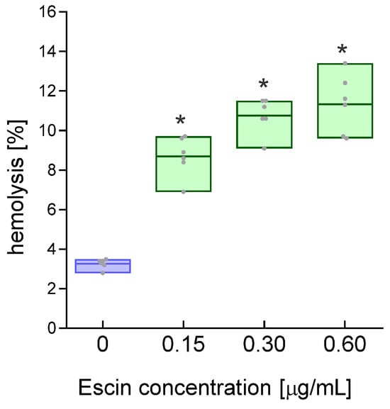 Hemolytic effect of escin on RBCs after 24 h of treatment. The data were expressed as mean with bars (min to max) and raw data, n = 7. Statistical significance: * p < 0.05 vs. control.