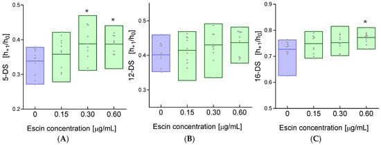 Changes in the h+1/h0 ratio for the (A) 5DS, (B) 12DS, and (C) 16DS spin labels incorporated into the cell membrane of RBCs treated with escin. The data were expressed as mean with bars (min to max) and raw data, n = 11. Statistical significance: * p < 0.05 vs. control.