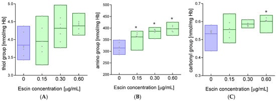 Changes in the level of (A) thiol, (B) amino, and (C) carbonyl groups in membrane proteins after incubation of RBCs with escin. The data were expressed as mean with bars (min to max) and raw data, n = 7. Statistical significance: * p < 0.05 vs. control.