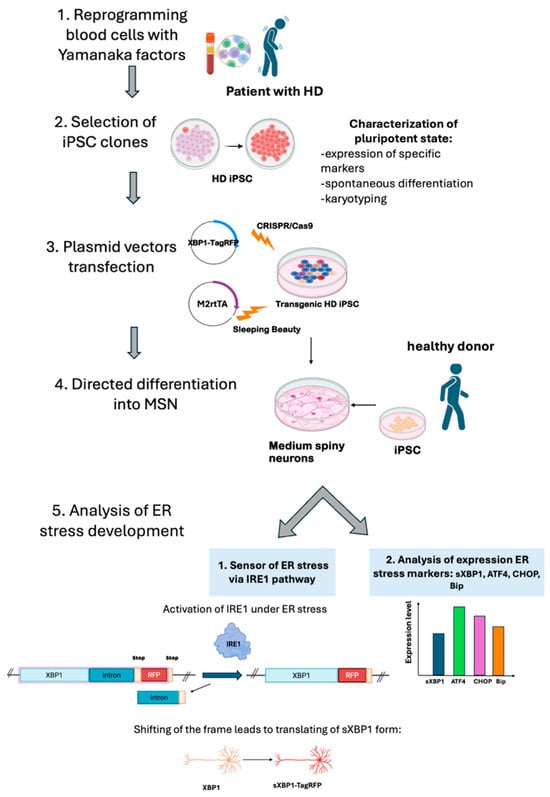 We aimed to assess the capability of the obtained iPSC lines to differentiate into MSNs. We used several differentiation protocols, as each one has its own limitations [25,26,27]. There are various approaches to neuronal differentiation [29]. Two methods have been highlighted in the literature—direct differentiation via the induction of expression of specific factors, and indirect differentiation mediated by signaling pathways regulated by specific chemicals [30]. We chose protocols based on chemical differentiation because of its recapitulation of natural development. The obtained MSN cultures were analyzed for their efficiency in developing ER stress (Figure 1).