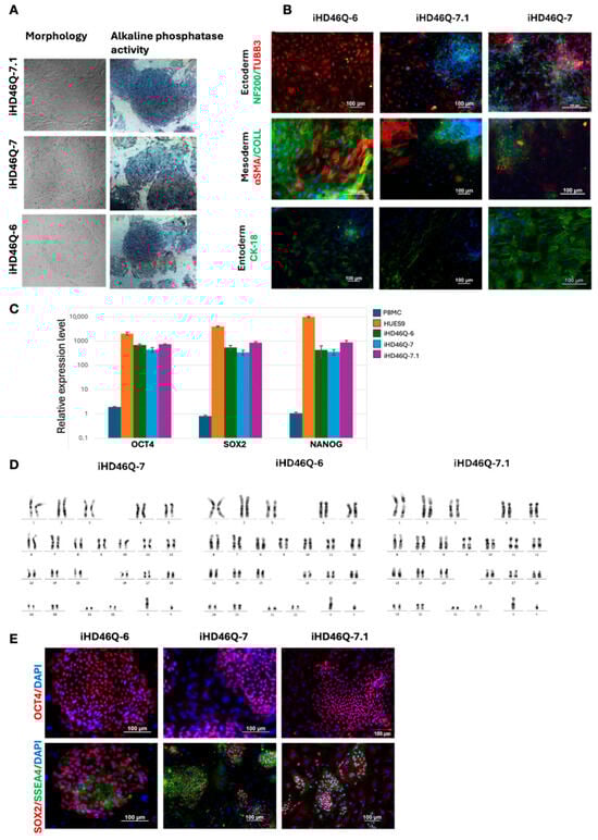 Characterization of iHD46Q iPSC cell lines. (A) Morphology of iPSC colony and alkaline phosphatase detection. (B) Immunofluorescence staining of iHD46Q-6, iHD46Q-7 and iHD46Q-7.1 cell cultures after in vitro spontaneous differentiation: αSMA and Collagen (mesoderm markers); TUBB3 and NF200 (ectoderm markers); CK-18 (endoderm marker). (C) Quantitative RT-PCR analysis of expression of pluripotency markers (NANOG, OCT4, SOX2). (D) Karyotype analysis (46,XY). (E) Immunofluorescence staining for pluripotency markers OCT4, SOX2, SSEA-4. All scale bars—100 μm.