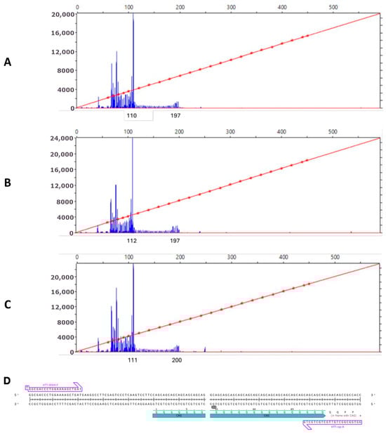 Genome DNA was amplified using BioMaster HS-Taq PCR-Color Kit (2×) (Biolabmix, Novosibirsk, Russia), 0.5 pmol/μL FAM-labeled Forward primer and 0.5 pmol/μL Reverse primer (Table 5) and 10% DMSO on Thermocycler T100 (Bio-Rad Laboratories, Singapore). Program parameters: 95 °C 5 min; 35 cycles—95 °C 15 s, 63 °C 15 s, 72 °C 25 s; 72 °C 25 min. Capillary electrophoresis was performed in the ICG Joint Centre for Genome Studies using capillary genetic analyzer Nanophore 05 (Syntol, Moscow, Russia), size standard CD-450. Data were analyzed using SequenceScanner software v2.0 (Thermo Fisher Scientific, Waltham, MA, USA).