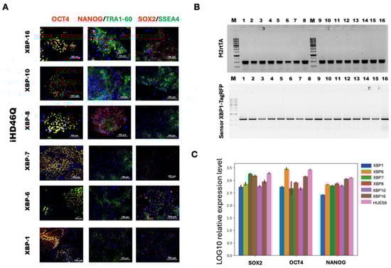 Characterization of the iHD46Q-7.1-based transgenic iPSC lines with XBP1-TagRFP construction in AAVS1 locus, and tetracycline transactivator M2rtTA, integrated by Sleeping Beauty method. (A) Morphology of iPSC colonies and alkaline phosphatase staining. (B) PCR-analysis of XBP1-TagRFP and M2rtTA transgene integration. (C) qPCR-analysis of expression of pluripotency markers SOX2, OCT4 and NANOG.