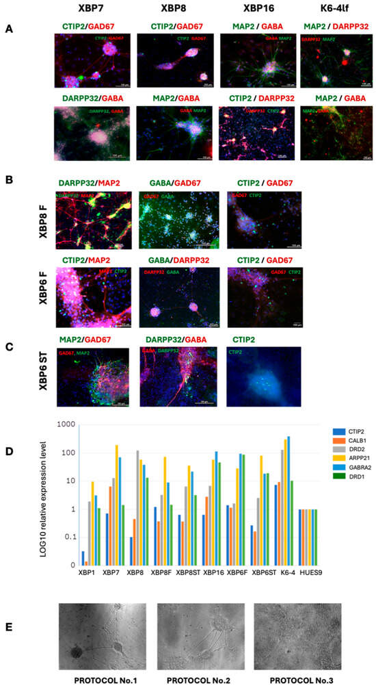 According to the second protocol [26], we obtained the XBP-6F and XBP-8F neural cultures after 40 days of differentiation. XBP-8F cells express the ARPP21 gene, whereas the XBP-6F cells demonstrate a high expression level of other important markers, such as GABRA2 and DRD1, characterizing the presence of MSNs with type 1 dopamine receptors in the cell population. Immunofluorescence staining also confirmed the presence of GABAergic neurons expressing DARPP32 and CTIP2.