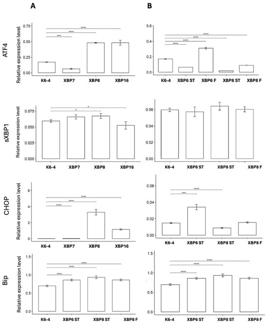 We consolidated data on the ATF4, sXBP1, CHOP and BIP gene expression levels compared to the healthy control K6-4 in Table 2. A general tendency towards ER stress development was observed in neuronal cultures obtained using the protocol No. 1. Some cases of up-regulation of ATF4, sXBP1 and CHOP were also observed in XBP-6F, XBP-6ST and XBP-8F. The expression of BIP was present in all neuronal cultures.