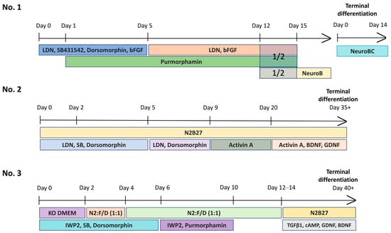iPSCs were cultured on Matrigel-GFR extracellular matrix (Corning, New York, NY, USA) in the Essential 8 medium (Thermo Fisher Scientific, Waltham, MA, USA) for 2–3 passages (Figure 9). After reaching the density 70–90%, colonies were separated using 0.5 mM EDTA and transferred to Petri dishes (⌀ 20 cm) coated with agarose, and cultured in knockout DMEM medium with the addition of 20% knockout serum substitute, 0.1 mM β-mercaptoethanol, 1% 100 × penicillin/streptomycin, 1% 200 mm of L-glutamine and 0.1 mM of interchangeable amino acids, 5 microns of Y-27632 (StemRD, Burlingame, CA, USA), 1 µM Dorsomorphin (Sigma-Aldrich, Darmstadt, Germany), 10 µM SB-431542 (StemRD, Burlingame, CA, USA) and 1 µM IWP2 (Sigma–Aldrich, Darmstadt, Germany) for the formation of embryoid bodies. Two days later, the medium was replaced with a 1:1 mixture of KSR and N2 media (DMEM/F-12 with 1:100 N2 (Thermo Fisher Scientific, Waltham, MA, USA) and 1% penicillin/streptomycin/L-glutamine) with ROCK, DM, SB and IWP2. On day 4, the medium was replaced with medium N2 using the same combination of small molecules. On days 6 and 8, the N2 medium was changed with the addition of 0.6 µg/mL of Purmorphamine (Stemgent, Beltsville, MD, USA) and 1 µg/mL of IWP2. On days 10 and 12, N2 medium was added without any small molecules. On day 14, the embryoid bodies were transferred to wells coated with Matrigel-GFR extracellular matrix (Corning, New York, NY, USA) and cultured in N2B27 maturation medium (DMEM/F-12 containing 1:200 N2, 1:100 B27 without vitamin A (Thermo Fisher Scientific, Waltham, MA, USA), 20 ng/mL of BDNF, 10 ng/mL of GDNF and 1 ng/mL of TGF-β3, 0.5 mM of dibutyryl cyclic AMP (PeproTech, Cranbury, NJ, USA). The medium was changed every four days.