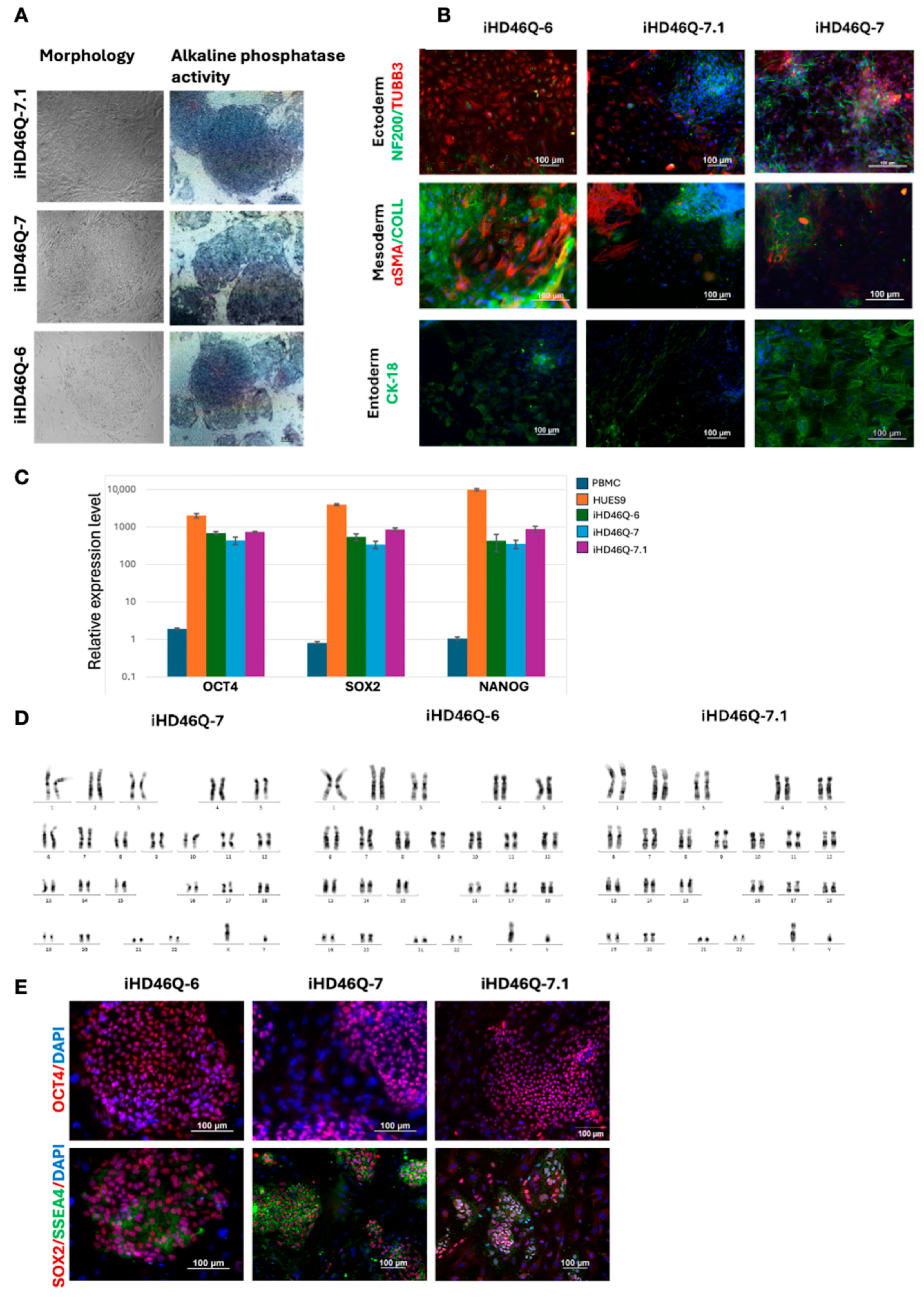 4.2. Generation of iPSC Lines by Reprogramming PBMCs of an HD Patient