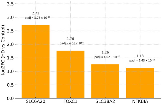 Four genes—FOXC1, NFKBIA, SLC38A2, and SLC6A20—were increased in HD BA9 when validated MIR219A2 targets from DIANA-TarBase were intersected with the up-regulated arm of the 80-gene BA9 core. Each points to a mechanistic axis of interest. NFKBIA encodes IκBα, a negative regulator of NF-κB; its increase may reflect compensatory feedback to chronic inflammatory activation, a putative driver of HD pathogenesis [61,62]. FOXC1 participates in pericyte/endothelial programs and has been associated with cerebrovascular development and barrier-related phenotypes, corresponding with emerging neurovascular contributions to HD [63]. SLC38A2 (SNAT2) is dynamically regulated by nutrient/stress cues and localizes to neurons and perivascular astrocytic end-feet, indicating altered amino-acid transport/metabolic signaling in BA9 [64,65]. Glycine/proline transport and NMDAR co-agonism modulation by SLC6A20 link solute transport to synaptic physiology, a recurring theme in HD circuit dysfunction [66].