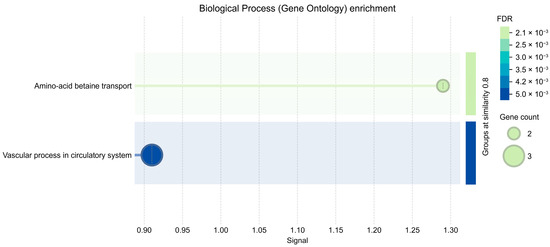 In an exploratory GO–Biological Process summary that applies semantic similarity reduction to deduplicate terms, a small number of BP categories reached FDR < 0.01 but involved only 2–3 genes per term and should therefore be interpreted cautiously (Figure 4). For clarity, the exploratory GO-BP bubbles (Figure 4) were generated using relaxed parameters for visualization; no term passed FDR < 0.05 in the primary analysis, and those signals should be considered hypothesis-generating. Bubble plots were produced under relaxed display thresholds in STRING to summarize trends; inferential calls relied on our primary pipeline (expressed-gene background, BH-FDR), where no GO-BP term was significant at FDR < 0.05.