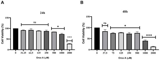 Cytotoxic effect of Orox A on Hep3B cancer cells at (A) 24 and (B) 48 h. Growth inhibition on Hep3B cells after 24 and 48 h treatment by different concentrations of Orox A, ranging from 0 to 2000 μM, was evaluated via MTT assay. IC50 value of Orox A for Hep3B cells was calculated as 1385 μM at 24 h via CompuSyn version 1.0 software. Obtained data was analyzed using ordinary one-way ANOVA test. p-values < 0.05 were considered as statistically significant (*). p-values less than 0.001 were designated with (***). p-values > 0.05 were reported as statistically not significant (ns). Each group had three biological replicates.
