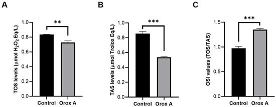 Amounts of TAS and TOS in Hep3B cells treated with 1385 μM Orox A (A,B), and ratio of TAS and TOS to each other (C). The levels of TAS (A) and TOS (B), as well as the calculated TOS/TAS ratio, OSI values (C), in the control and Orox A-treated Hep3B, hepatocellular carcinoma cell line, were depicted using GraphPad Prism (Version 8.0.2, GraphPad software Inc., San Diego, CA, USA). The results were indicated as p-values between 0.01 and 0.001 were designated with (**), <0.001 were designated with (***).
