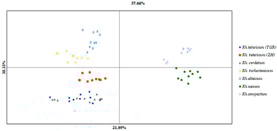 The highest values across all indices were observed in Rh. tataricum (TUR) (Na = 1.350; Ne = 1.376; I = 0.335; He = 0.222; uHe = 0.234), indicating a relatively high level of genetic diversity at the amplification loci in this species. Similarly, elevated values were recorded for Rh. altaicum (Na = 1.263; Ne = 1.298; I = 0.284; He = 0.183; uHe = 0.193).