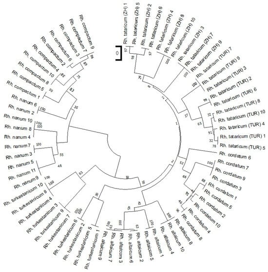 The dendrogram, comprising two principal clusters, clearly reflects the grouping of samples according to species identity and corresponds well with their distribution along the PCoA axes. The upper, larger cluster is further divided into two clades: one consists of Rh. turkestanicum samples, which are separated from the second clade by a high bootstrap value of 99%. The second clade includes Rh. tataricum, Rh. altaicum, and Rh. cordatum. Within this clade, the two populations of Rh. tataricum, TUR and ZH, form a distinct subcluster, supported by bootstrap values ranging from 18% to 62%. The lower cluster contains Rh. compactum and Rh. nanum samples, which are grouped together with strong bootstrap support values ranging from 96% to 100%.