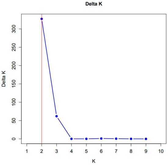 Results of Bayesian assignment analysis conducted using the STRUCTURE software. The Delta K (ΔK) values were plotted against various assumed numbers of clusters (K), identifying K = 2 (red line) as the most likely number of genetic clusters.