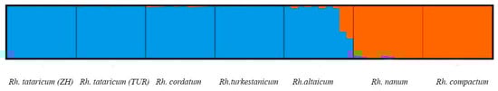 The lowest genetic diversity was observed in Rh. compactum, which showed the minimal values across all parameters (Na = 0.888; Ne = 1.117; I = 0.183; He = 0.115; uHe = 0.121). The highest number of unique alleles, those specific to a single species, was detected in Rh. tataricum (TUR), Rh. cordatum, Rh. altaicum and Rh. nanum, (two unique alleles), while no rare alleles were identified in Rh. compactum and Rh. tataricum (ZH).